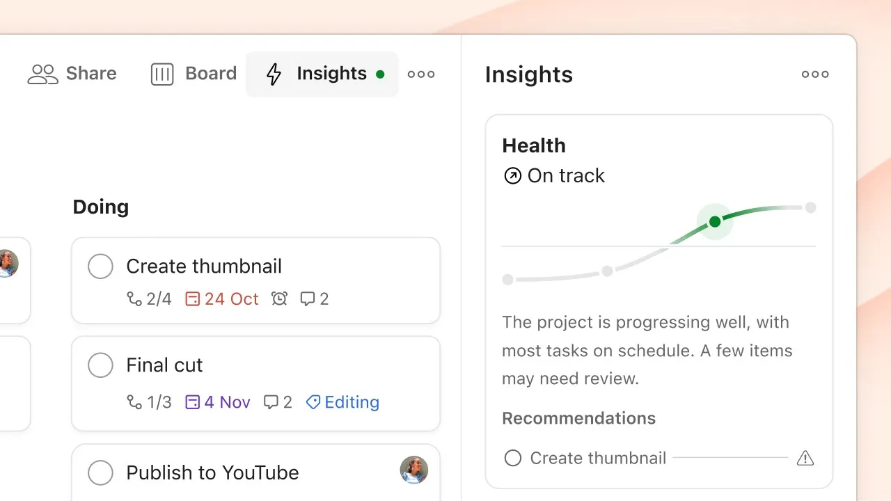 Stav – Automatické souhrny, které vám poskytnou skutečný kontext, nejen červené/žluté/zelené indikátory. Uvidíte například: „Projekt se hýbe vpřed, ale nekonzistentně. 2 úkoly jsou zpožděné, 1 má nejasného vlastníka.“