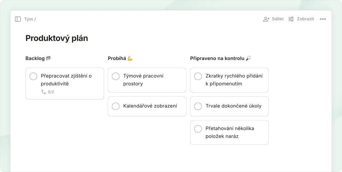 Brainstormujte v nástěnkách, plánujte pomocí seznamů, blokujte si čas v kalendáři – vše na pár kliknutí.