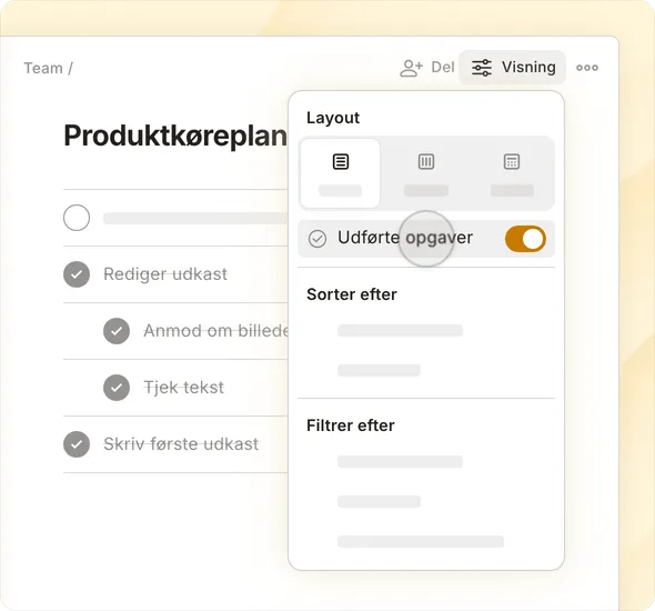 Skift mellem liste, kalender eller tavle for nemt at planlægge og følge selv dine mest ambitiøse projekter.