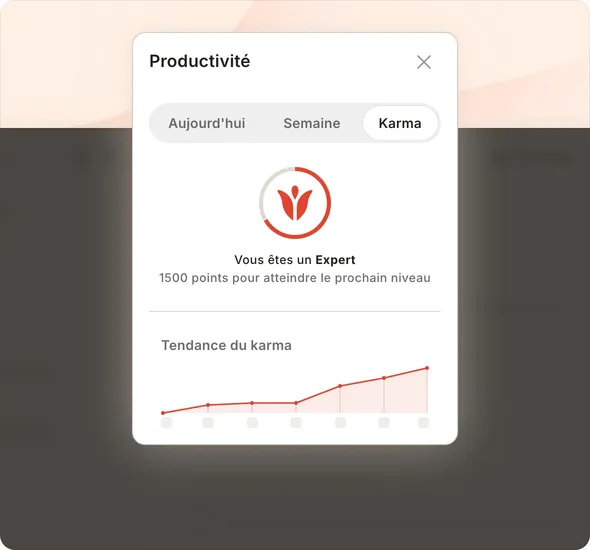 Nouveau sur Todoist ? Vous commencez comme débutant. À mesure que vous utilisez Todoist, vous progressez dans huit niveaux de karma différents, jusqu'à atteindre le niveau Éveillé.