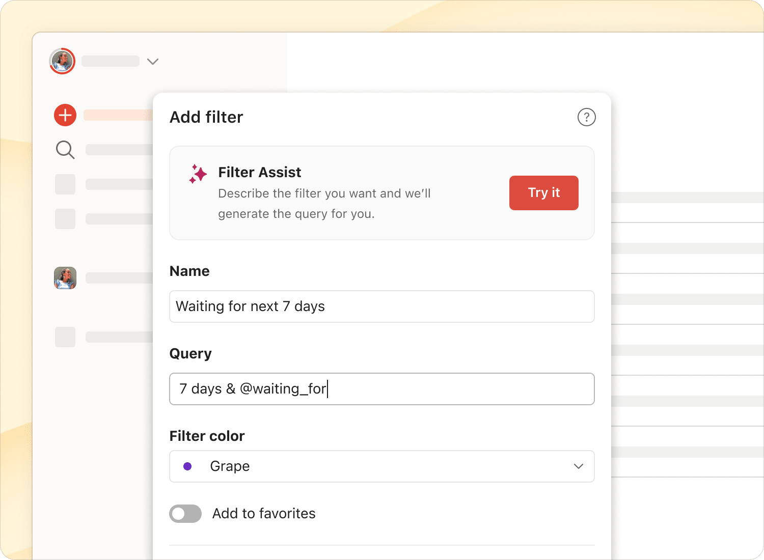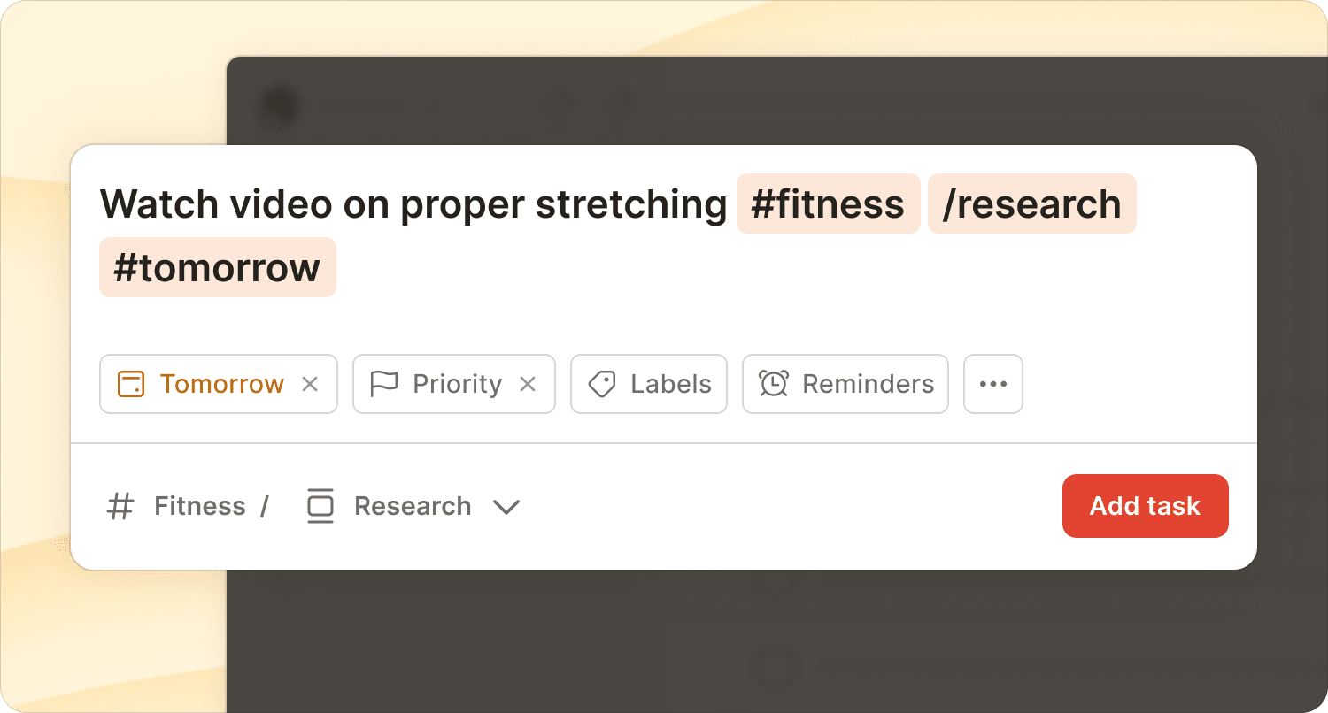When you're in the flow of processing email, use Todoist's Quick Add feature to capture tasks instantly. Press the keyboard shortcut Q or click + Add task to open the Quick Add window. Input the task details (including a due date) and add it to your list.