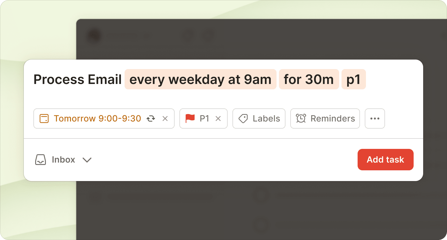 Block time on your calendar for processing emails. Switch to Todoist's calendar layout and create specific time slots. Then, set up a recurring task using natural language. Like Process Email every weekday at 9am for 30m.