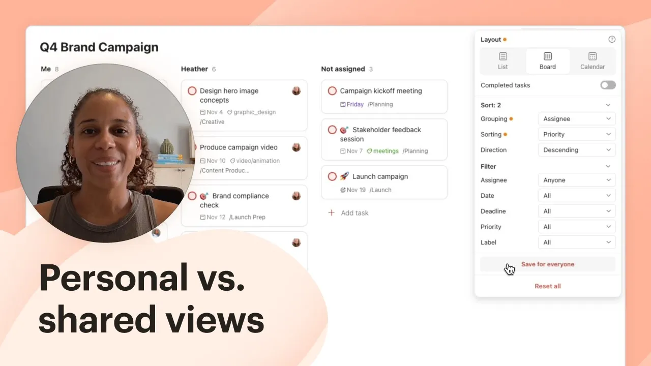 Once you’ve customized your project view using the grouping, sorting, and filtering options, you can save your layout as the default view by selecting Save for everyone. This ensures that all project collaborators see the same default view.