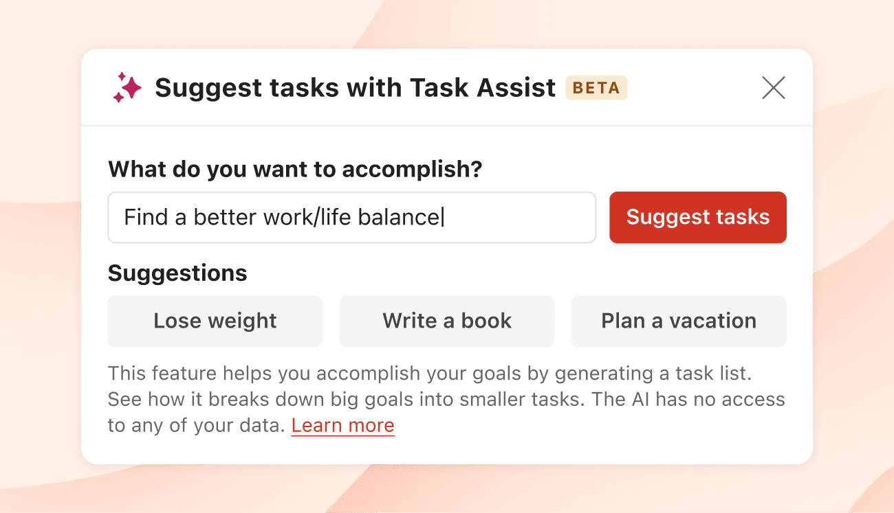 - In the modal that opens, use the text field to enter a task that you want to break up into smaller chunks and click Suggest tasks.