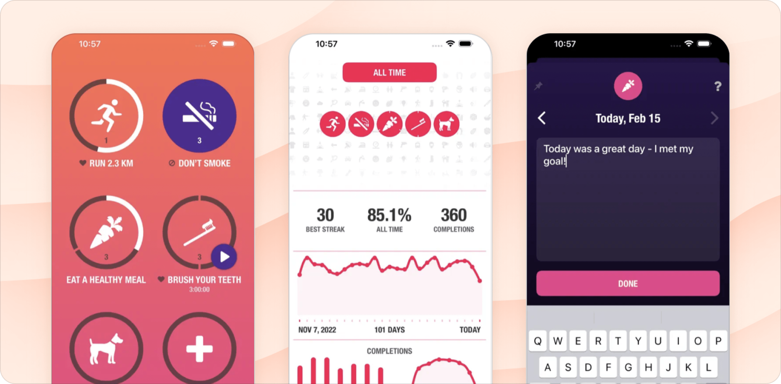 The app will help you build consistency with built-in statistics that showcase your longest streaks, number of successful days, and your most productive time of day and day of the week.