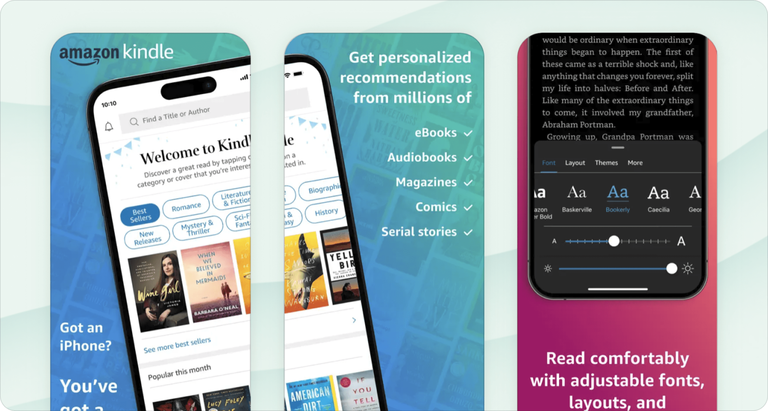 The Kindle app gives you access to a world's worth of books in your pocket and lets you customize the font, text size, background color and more so you can read exactly the way you want to. (Dark mode for night-time reading is a lifesaver!)