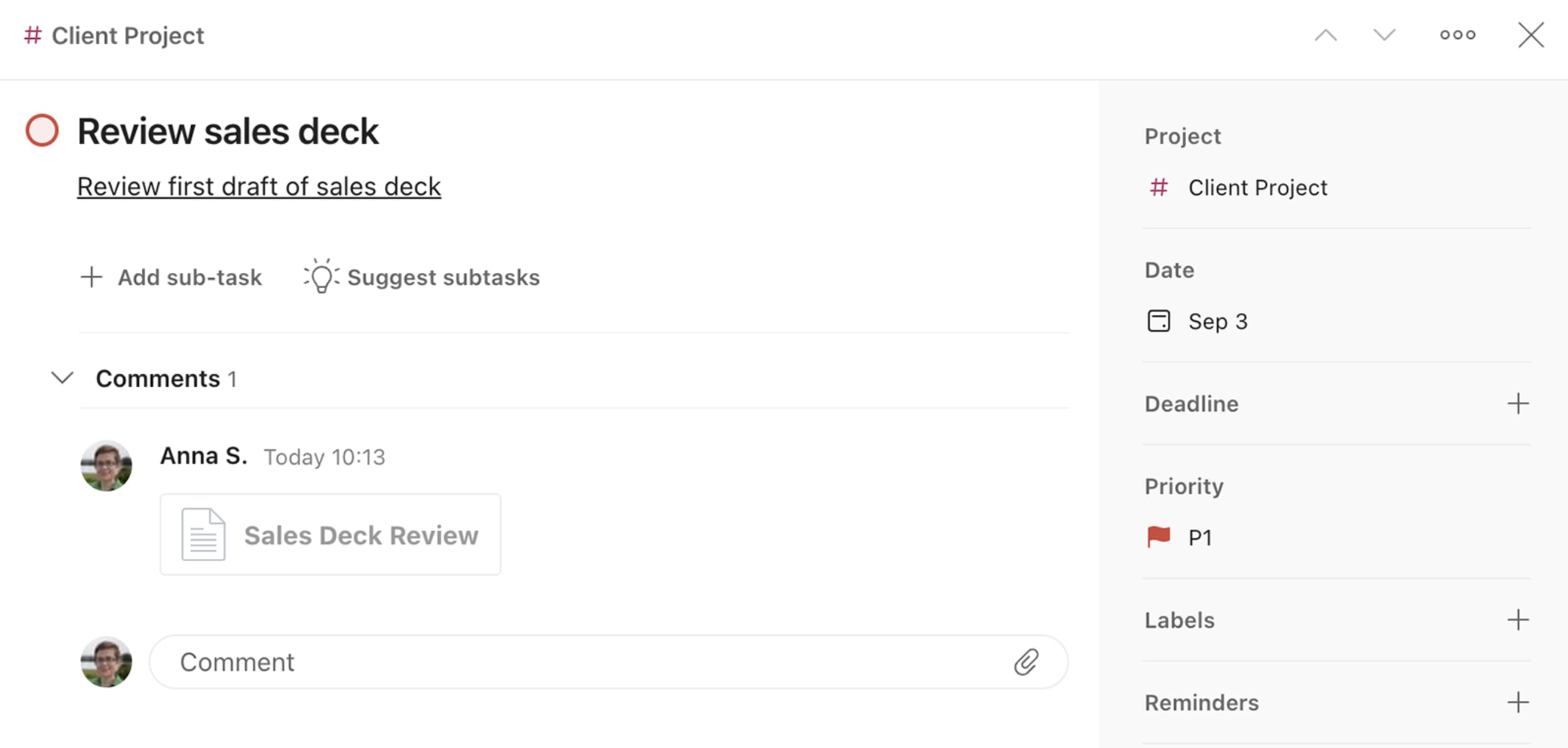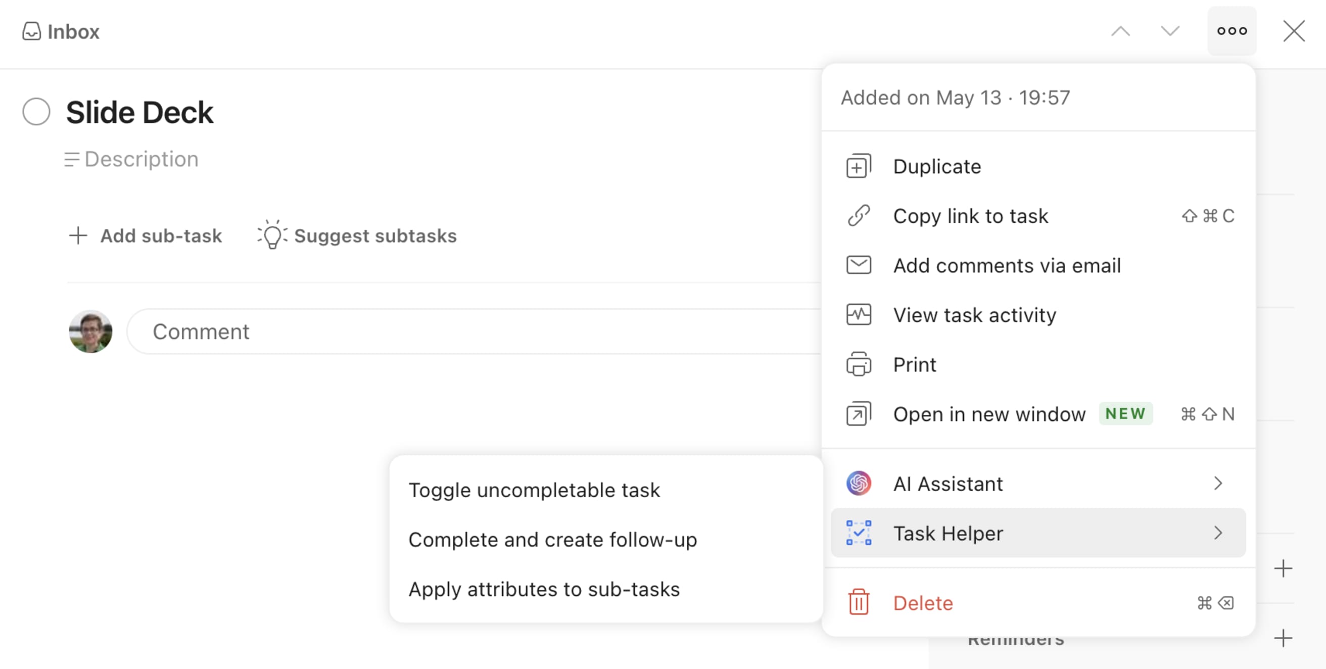 Then, you can accept AI Assistant’s recommendations, add its tips as a comment, or turn the suggested steps into sub-tasks with one click.