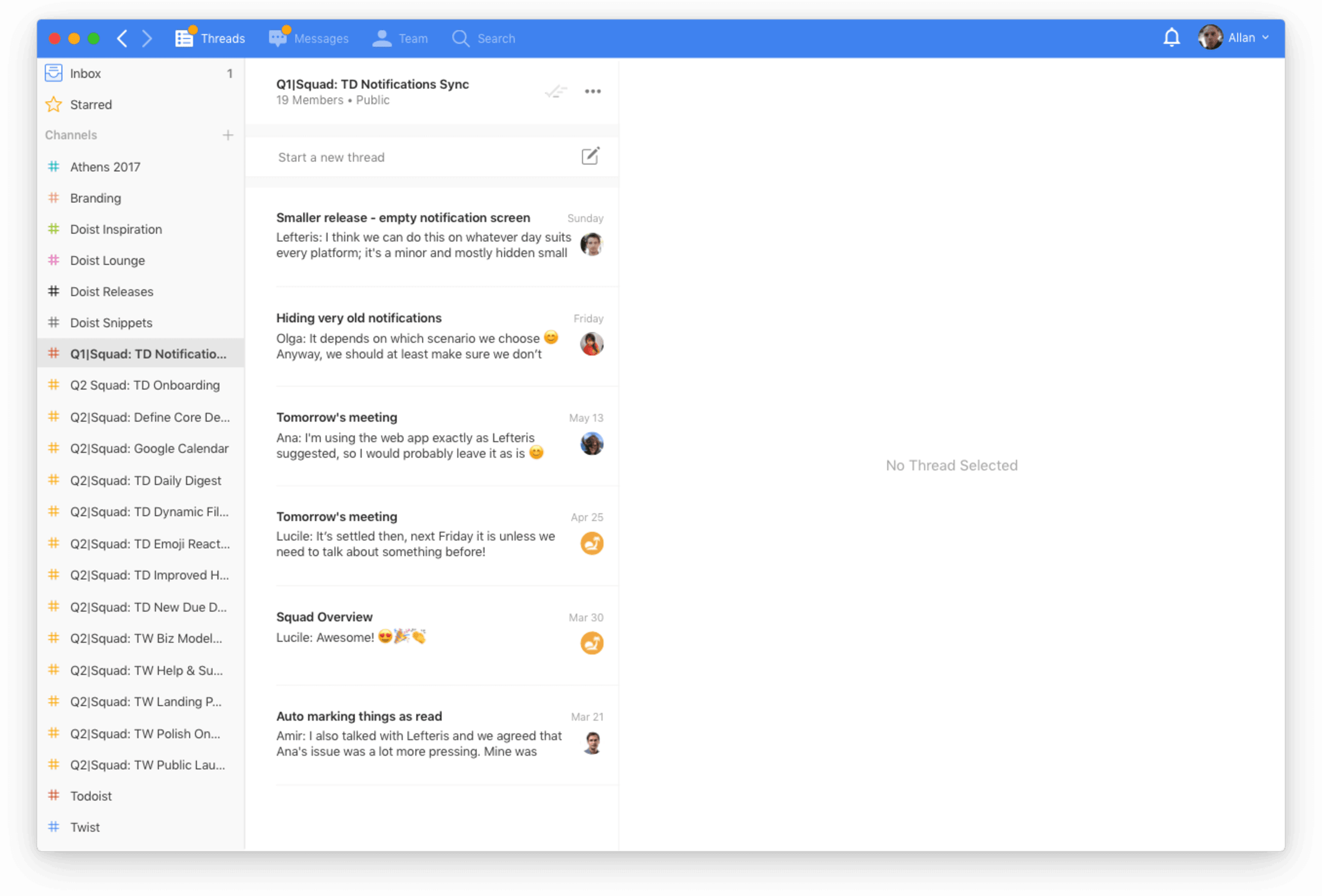 It was then that we decided to double down on the product development of Twist. After just 4-5 months, we moved the entire team – and all of our company’s communication – from Slack to Twist in one go. It was rough. I recall having calls with colleagues about how we felt Twist just didn’t do it for us, we were missing Slack and all its bells and whistles.