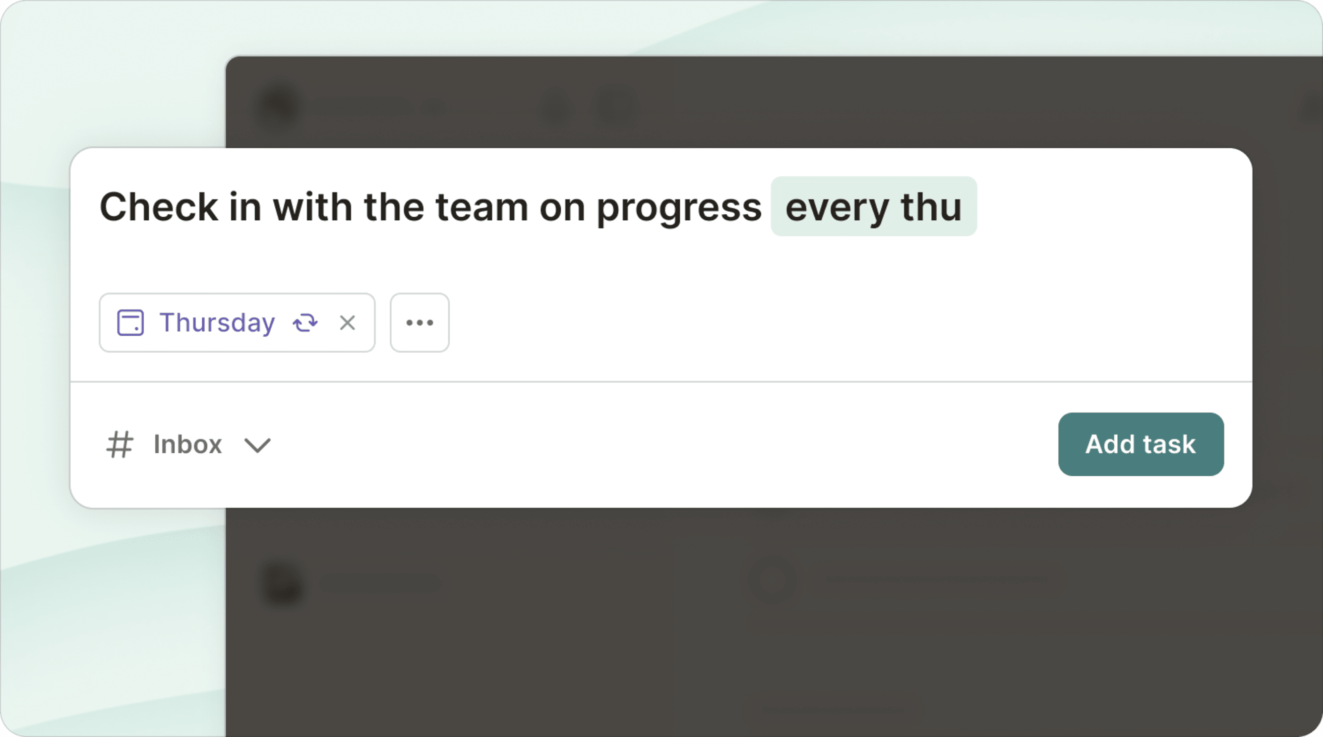 So, for instance, if you want to do a weekly progress check-in with the team every Thursday, just write, “Check-in with the team on progress every Thursday,” and Todoist will set it up as a recurring task