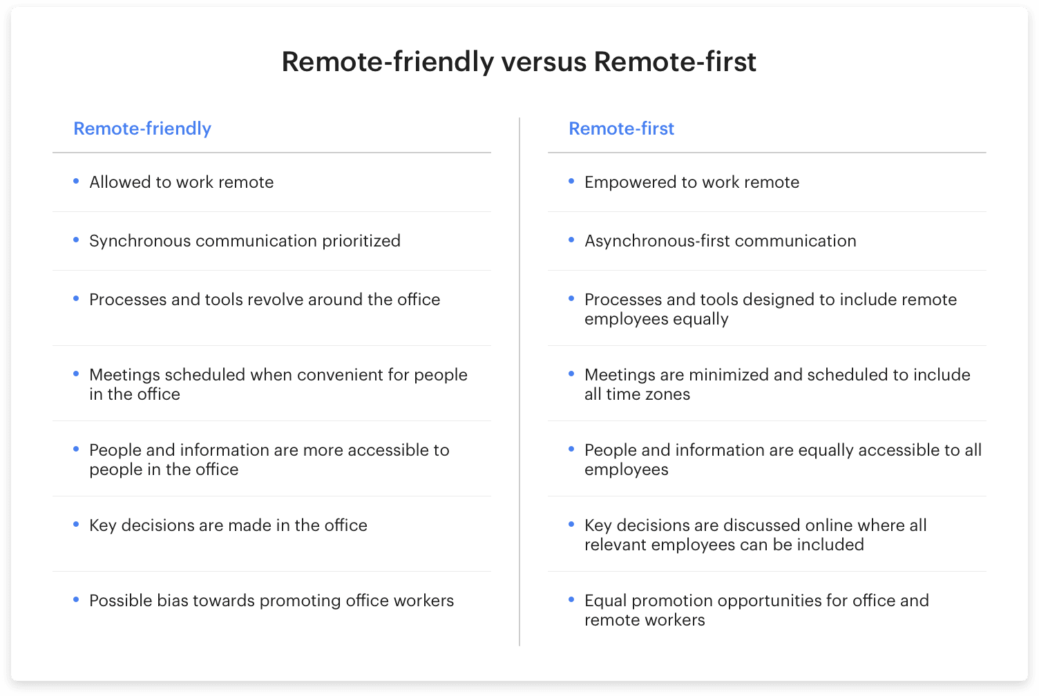 In contrast, a remote-first company doesn’t just allow employees to work remotely—it will empower them to. Remote-first companies make asynchronous communication the default, where employees can check and respond to messages at a time that best suits them in their particular time zone. Meetings, tools, and processes guarantee remote teammates equal opportunities to contribute ideas and access information. In fact, the company may not have an office at all. When it comes to promotions, remote and co-located teammates are all on an equal footing.