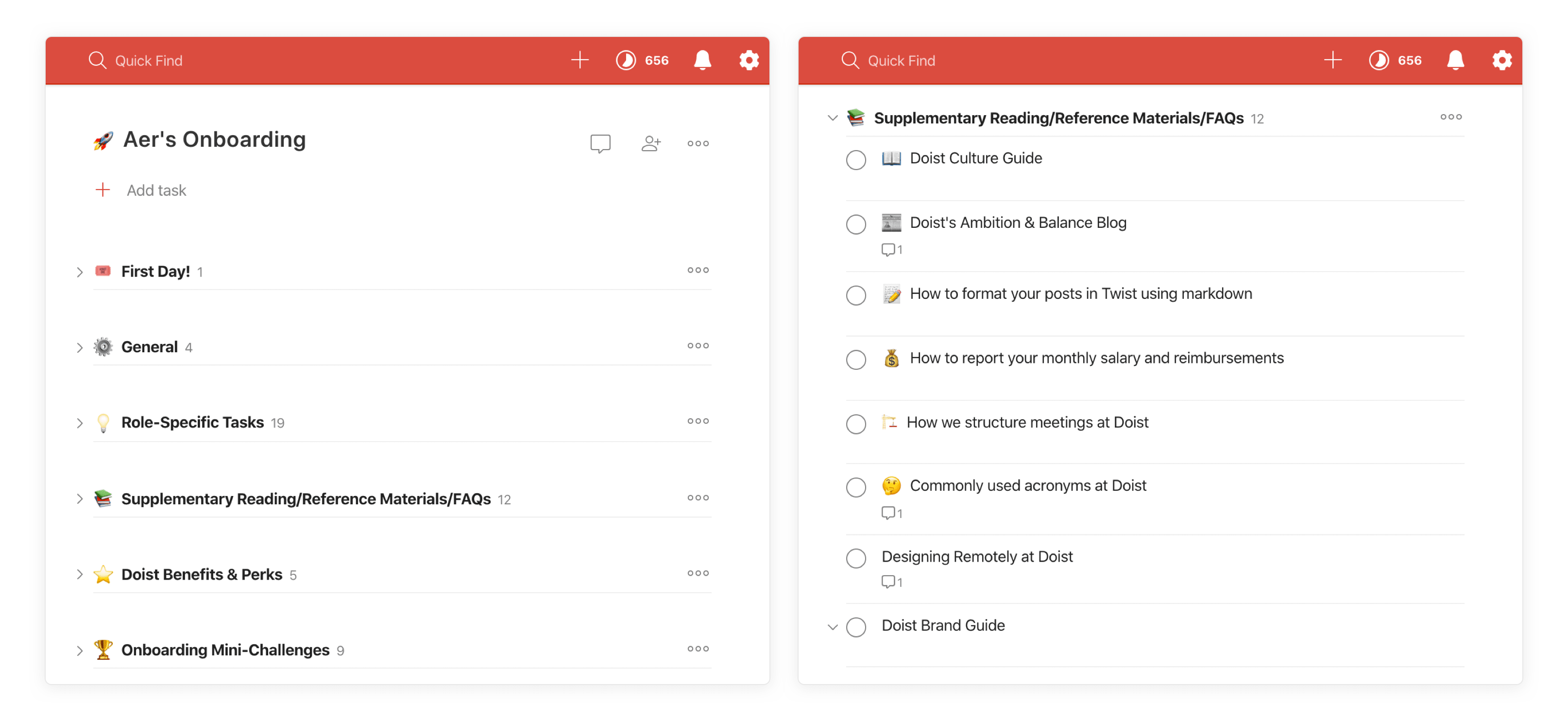 When I joined Doist, it was clear that our onboarding project could be more organized, engaging, and supportive for our new hires as they acclimate to our culture and processes. I make a Todoist onboarding project highly effective by:
