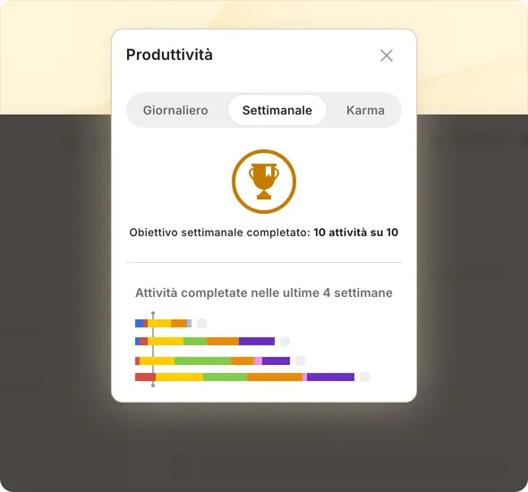 Piccoli passi ogni giorno aiutano a conquistare qualsiasi obiettivo. Imposta obiettivi giornalieri e settimanali, poi visualizza l'andamento della tua produttività e segui ogni progresso.