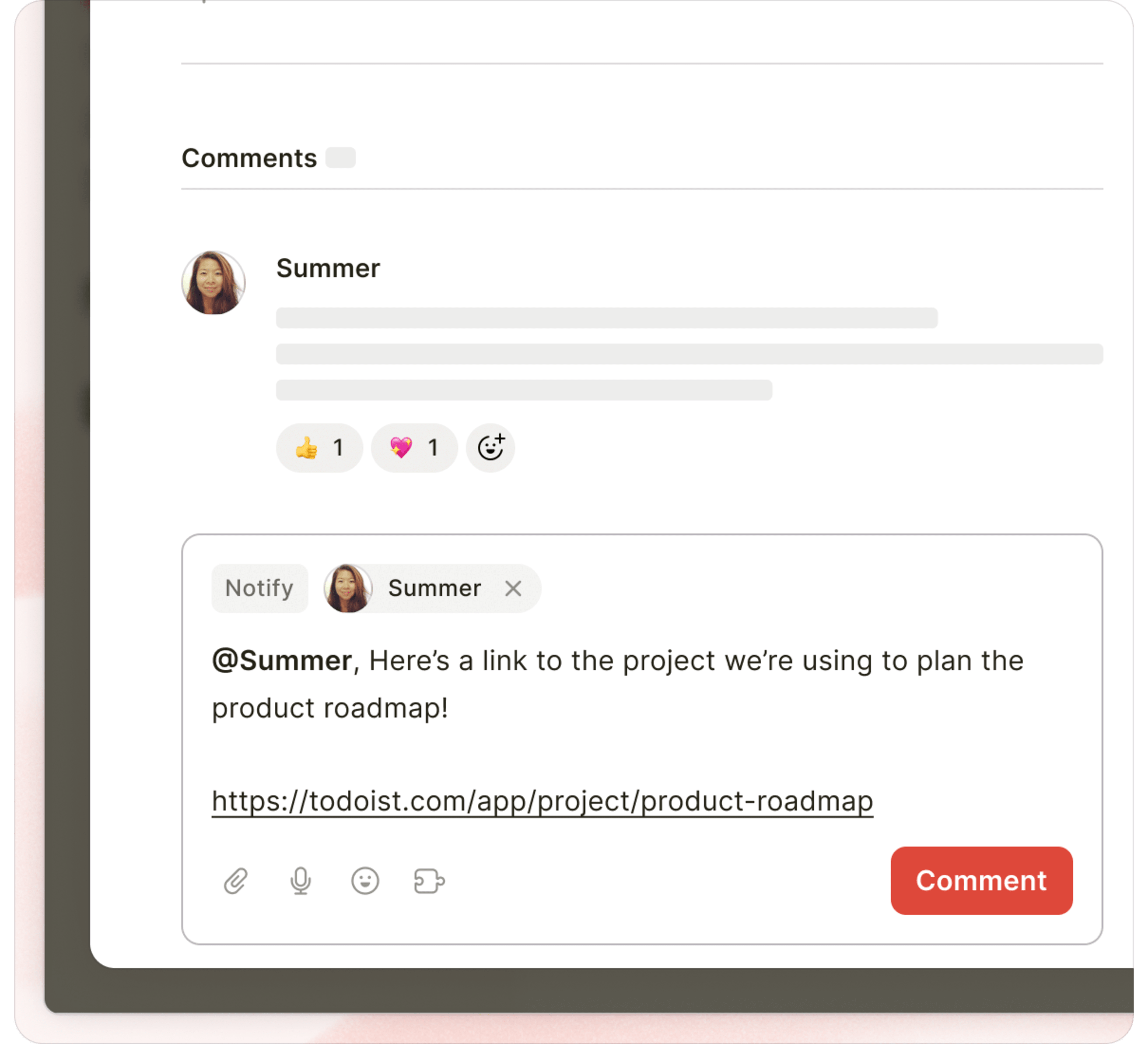 - Notifica le persone interessate in un commento all'attività, in modo che siano sempre aggiornate sullo stato e sui progressi del lavoro.
