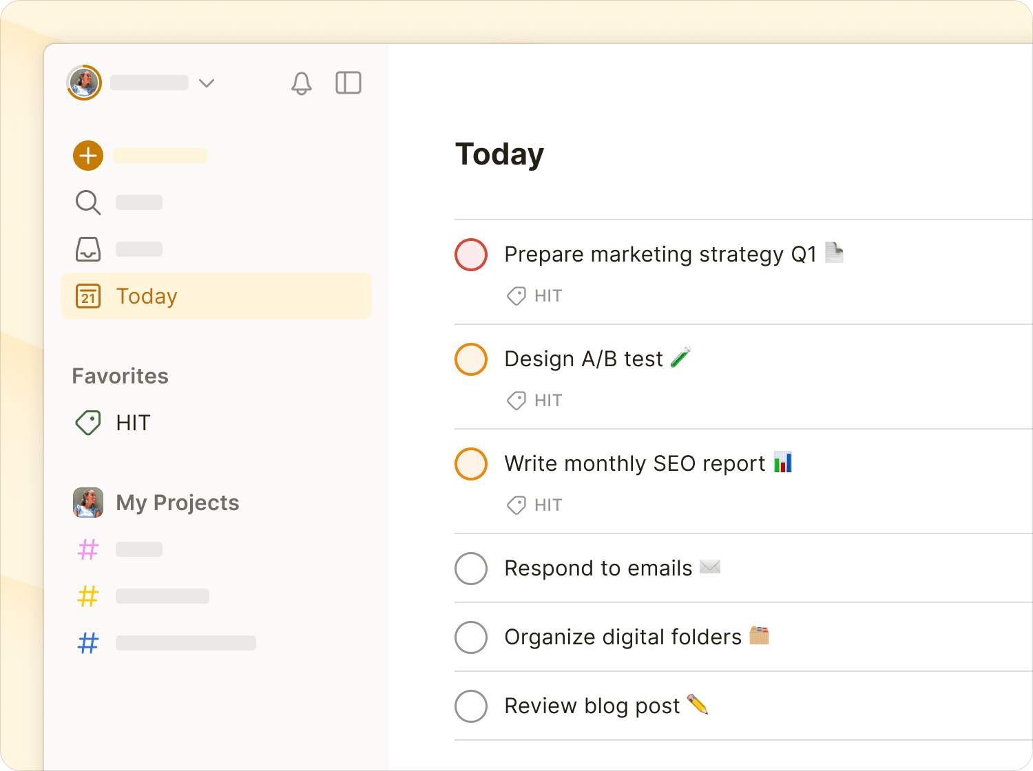 Create a label called â@HITâ or âhigh-impactâ(for your high-impact tasks). Then assign that label to the tasks that impact your goals. If you have tasks for different areas, create projects to organize your tasks per category and move them there.