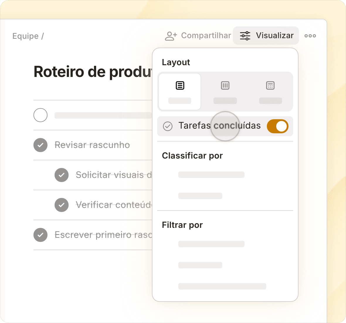 Altere entre lista, calendário ou painel para planejar e monitorar facilmente até mesmo os seus projetos mais ambiciosos.