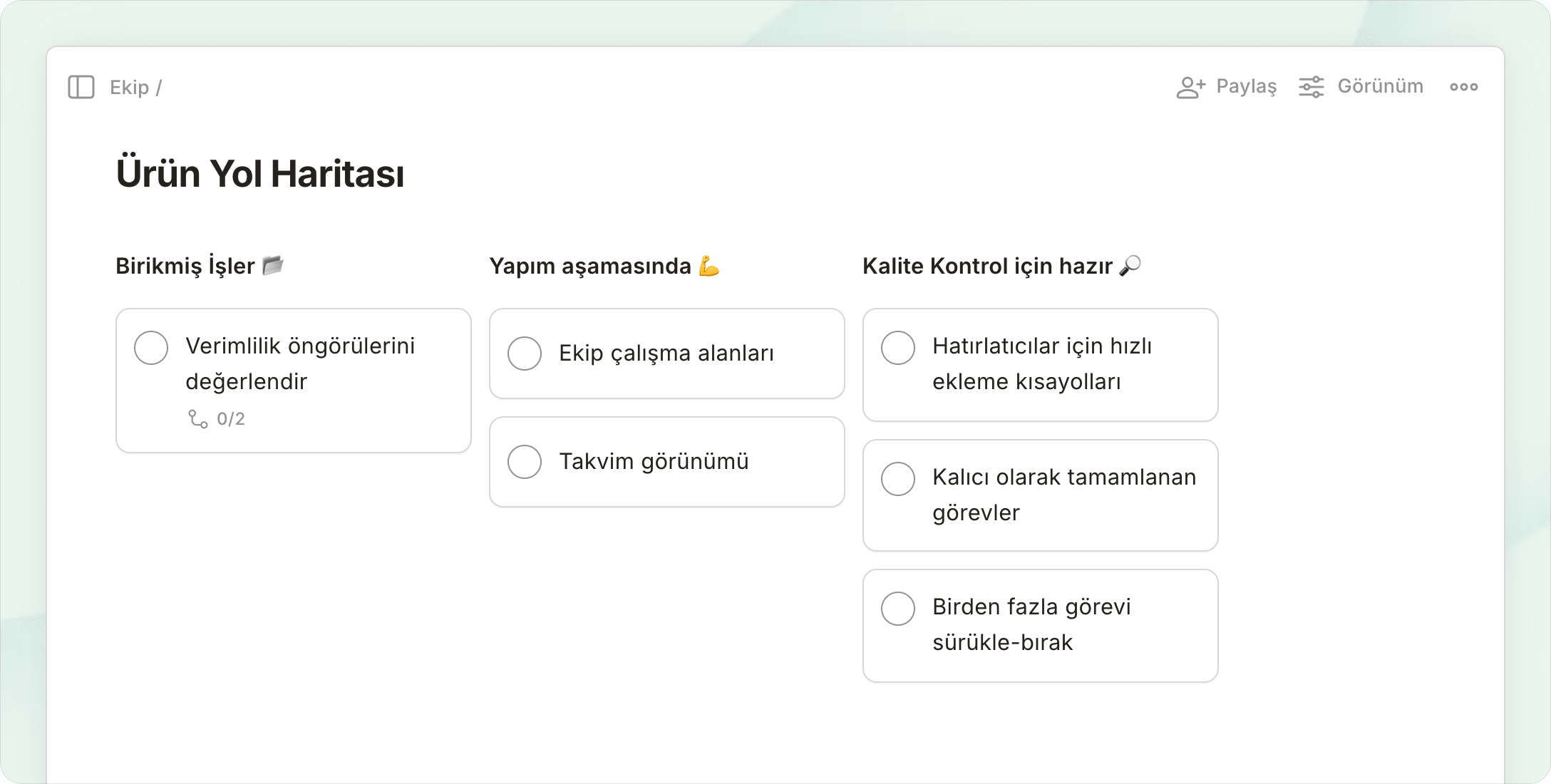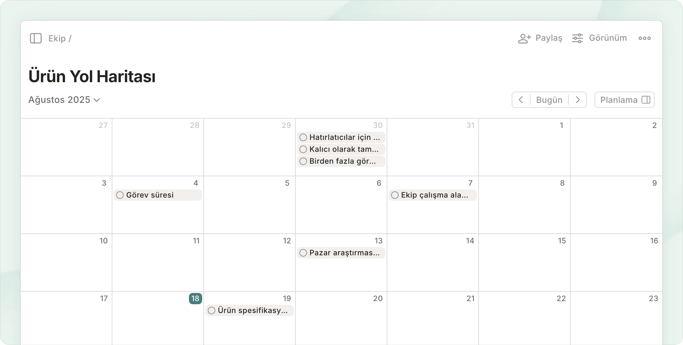 Liste, takvim veya pano düzenleri arasında geçiş yaparak en zor projelerini bile kolayca planlayabilir ve takip edebilirsin.