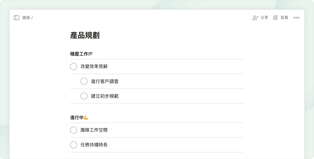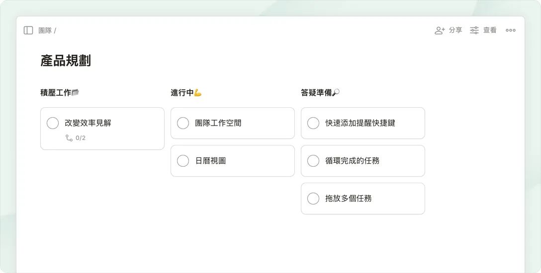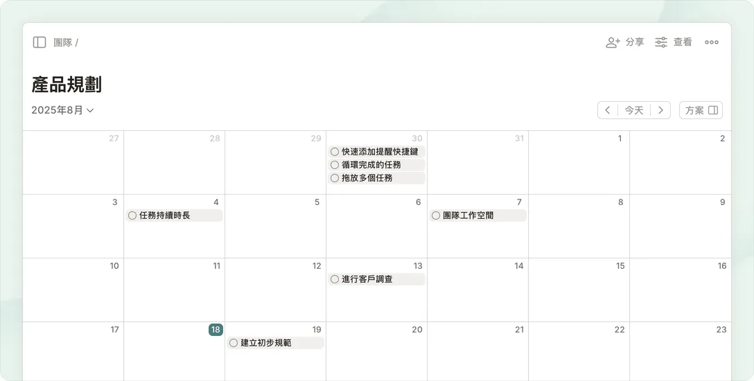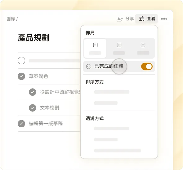 切換列表、日曆或看板視圖來輕鬆計劃和跟進您最重要的項目。
